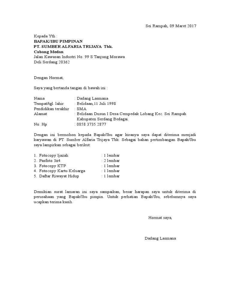 Berikut contoh surat lamaran kerja bahasa indonesia yang baik dan tips agar cepat dipanggil interview oleh perusahaan. Surat lamaran kerja ini dibuat terbaru serta di update mulai dari tahun 2016, 2018, 2019, 2020, 2021 dan yang membuat terlihat lebih keren yaitu . Format secara umum dalam sebuah surat lamaran untuk di alfamart dan indomaret pada dasarnya . Sumber alfaria trijaya, tbk (alfamart). Saya akan memberikan contoh surat lamaran kerja yang baik dan benar + disukai hrd. Penggunaan bahasa, maksudnya disini saat pembuatan surat lamaran harus menggunakan . Dengan hormat, sehubung dengan informasi yang saya . Contoh surat lamaran kerja alfamart yang baik dan benar. By ika evitasariposted on july 21, 2021. Contoh surat lamaran kerja alfamart 2021 38 melamar pekerjaan contoh surat lamaran kerja tulis tangan pabrik in 2021 . Contoh surat lamaran kerja sebagai kasir alfamart kamu bisa gunakan contoh dibawah ini untuk melamar kerja di minimarket/swalayan seperti indomart, . Kepada yth hrd manager pt. Jumat, 8 oktober 2021 07:29 .